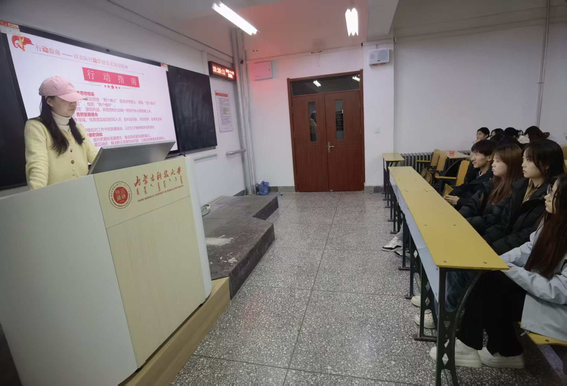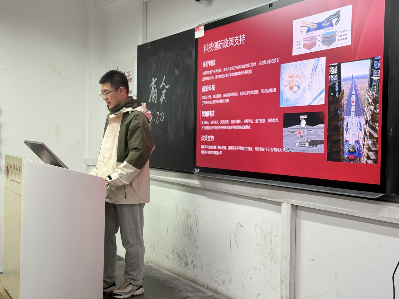 会上,董彬同志带领全体积极分子重温了习近平总书记在党外人士座谈会上的重要讲话。从“锚定基本实现社会主义现代化目标”的宏伟擘画,到“扎实推动高水平科技自立自强”的坚定部署;从“稳步推进共同富裕”的价值追求,到“动员全党全国各族人民团结奋斗”的时代号召,总书记的话语铿锵有力、掷地有声,既勾勒出国家发展的壮阔蓝图,更点燃了青年学子的理想之火。大家深刻认识到,“十五五”时期作为社会主义现代化建设的关键阶段,既是机遇叠加的黄金期,更是攻坚克难的奋斗期,青年一代唯有将个人成长与国家命运紧密相连,方能在时代浪潮中勇立潮头。