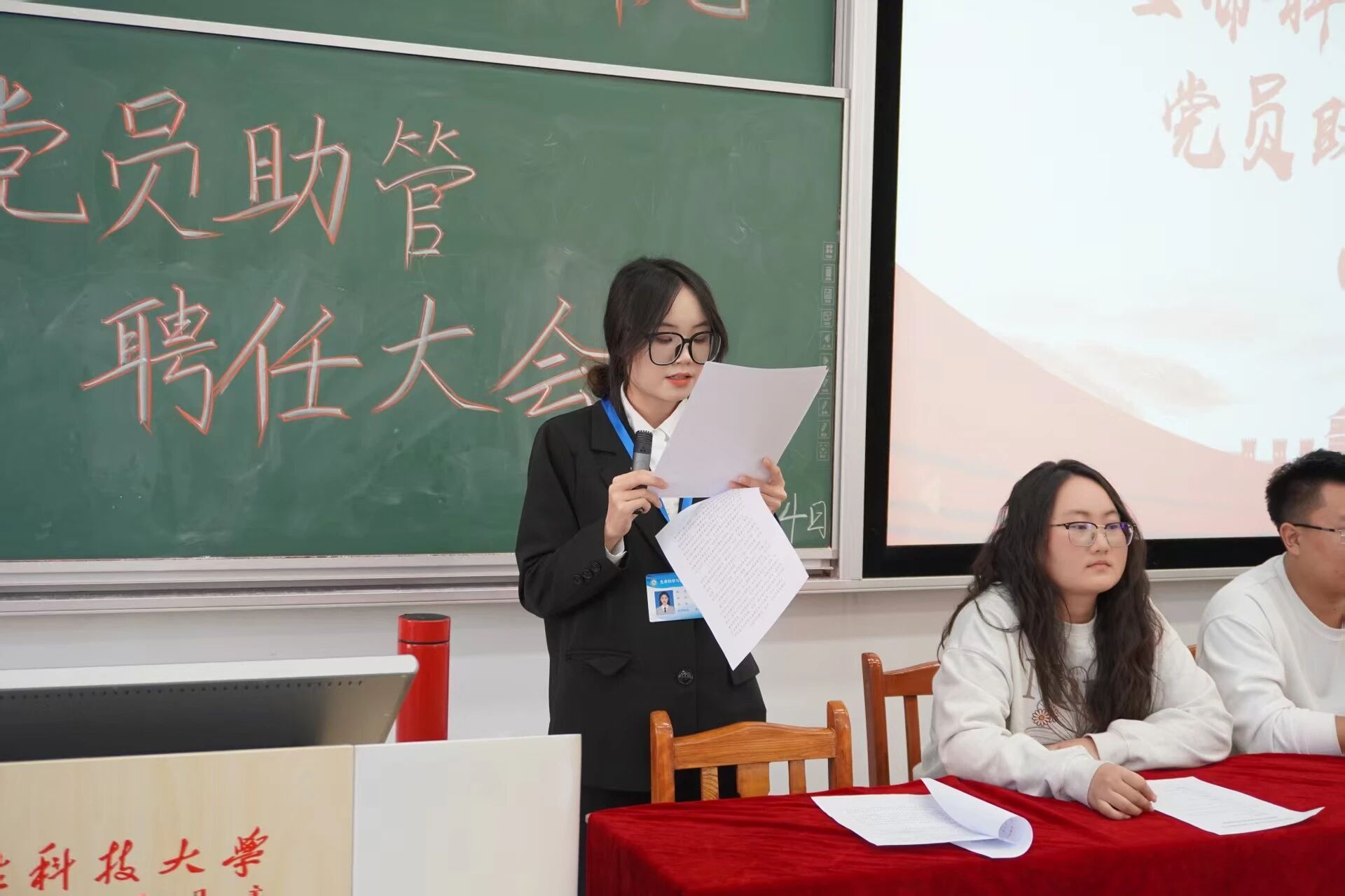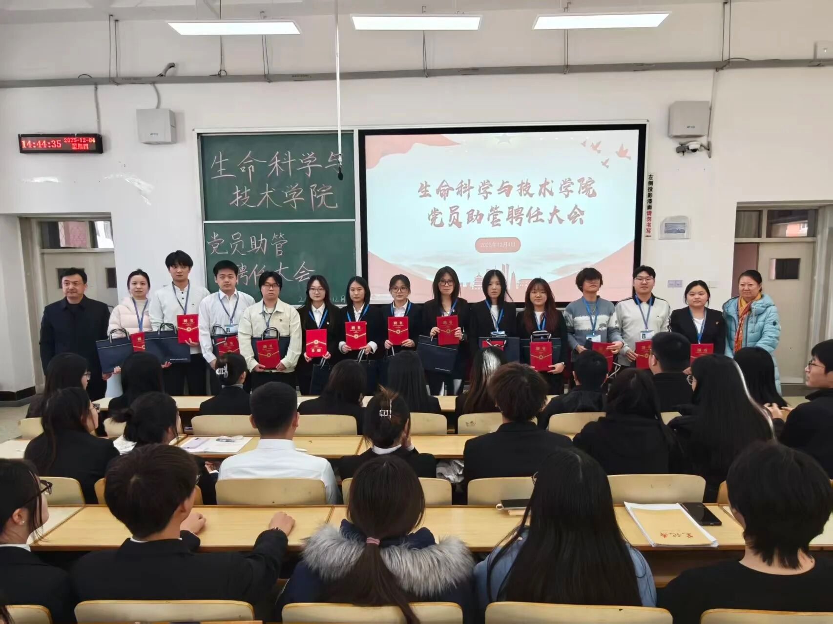 聘任仪式在庄严的氛围中拉开序幕。学院党委书记李德超宣读学院关于聘任党员助管的决议。随后,学院学工办负责人乌日根老师宣读了受聘党员助管名单。在热烈的掌声中,学院领导和年级辅导员依次为2025级、2024级、2023级及2022级的党员助管颁发了承载着信任与责任的聘书并佩戴工作证,领导和老师与同志们合影留念。