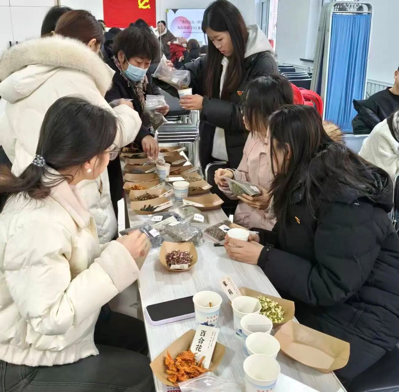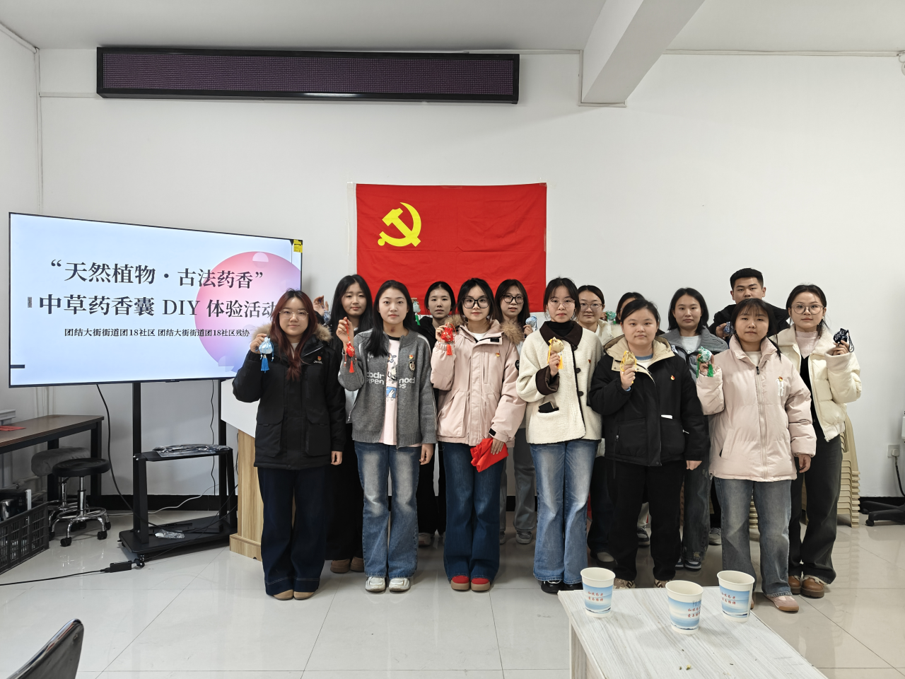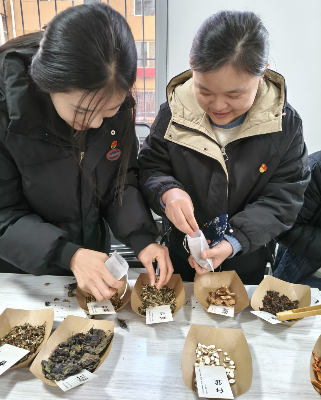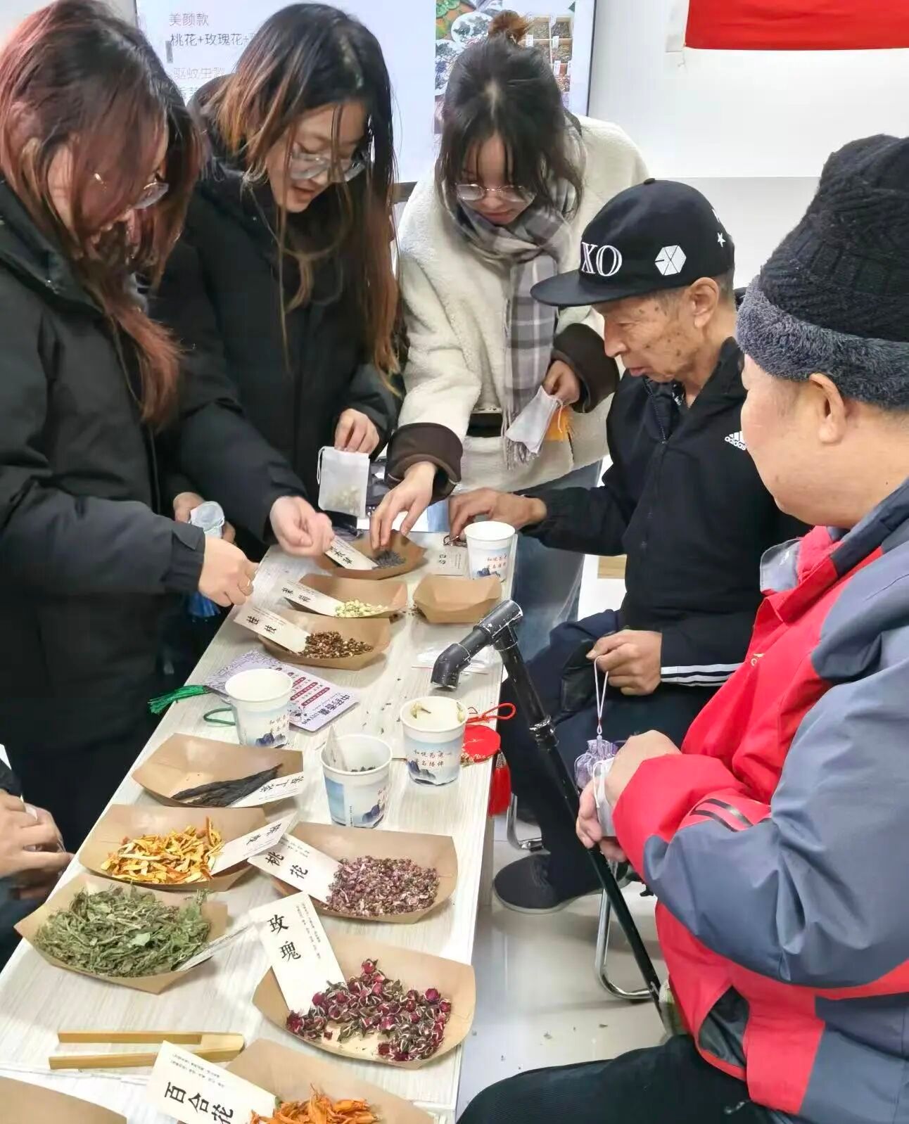 实操环节也是暖意融融,学生党员们分工帮扶。对于看不清药材标签的老人逐一介绍药材的功效;手把手教老人系香包绳结,还和老人聊起家常,关心他们的身体健康,叮嘱注意饮食调理;当有老人纠结配方时,党员同志主动上前了解其身体的情况,推荐丁香+高良姜的组合,边帮着混合药材边讲搭配原理。老人们一边跟着学做香包,一边分享过往的经历,党员们认真倾听,时不时呼应提问,现场满是温馨互动。