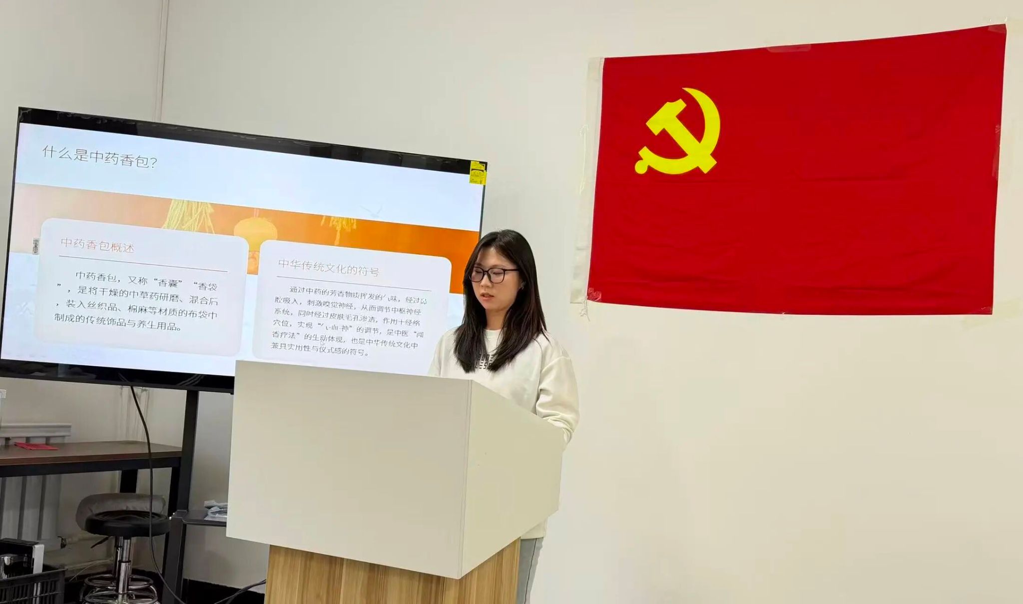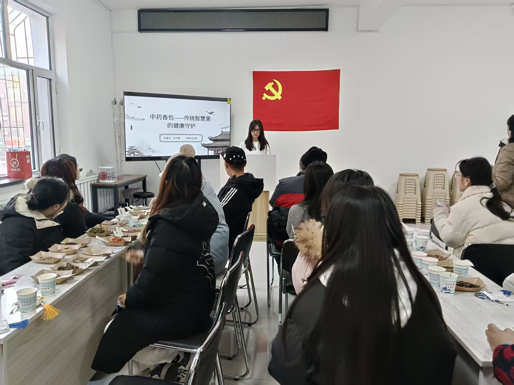 活动伊始,王子琪同志借助PPT从香包起源、养生价值、药材功效到制作使用展开讲解:中药香囊既是中医“闻香疗法”的生动体现,也是承载文化记忆的符号。针对老年人体质特点,她重点介绍了香包的优势:通过气味调节身心,对脏腑无负担,还能舒缓情绪,实现身心双重呵护。同时结合季节与体质需求,逐一介绍了常见中药功效:丁香、桂枝可温中散寒,预防风寒感冒,薰衣草能镇静安神改善睡眠,香茅草、藿香可夏季驱蚊虫,桃花、玫瑰花助力调理气色等。