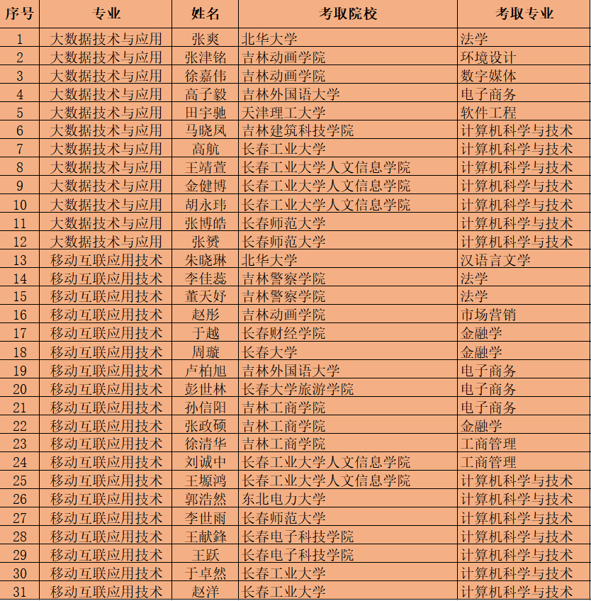 近日,2023年吉林省普通高校专升本教育考试录取结果已公布,beat365在线唯一官网登录2023届专科毕业生(大数据技术与应用专业、移动互联应用技术专业)共计46名同学报考,其中31名同学分别被天津理工大学、东北电力大学、长春工业大学、长春大学、北华大学等高校录取。