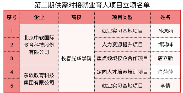 近日,教育部高校学生司公布第二期供需对接就业育人项目立项名单。长春光华学院beat365在线唯一官网登录与北京中软国际教育科技股份有限公司联合申报的3个项目成功入选,分别为就业实习基地项目、人力资源提升项目和重点领域校企合作项目;与东软教育科技集团有限公司联合申报的2个项目成功入选,分别为定向人才培养培训项目和就业实习基地项目。