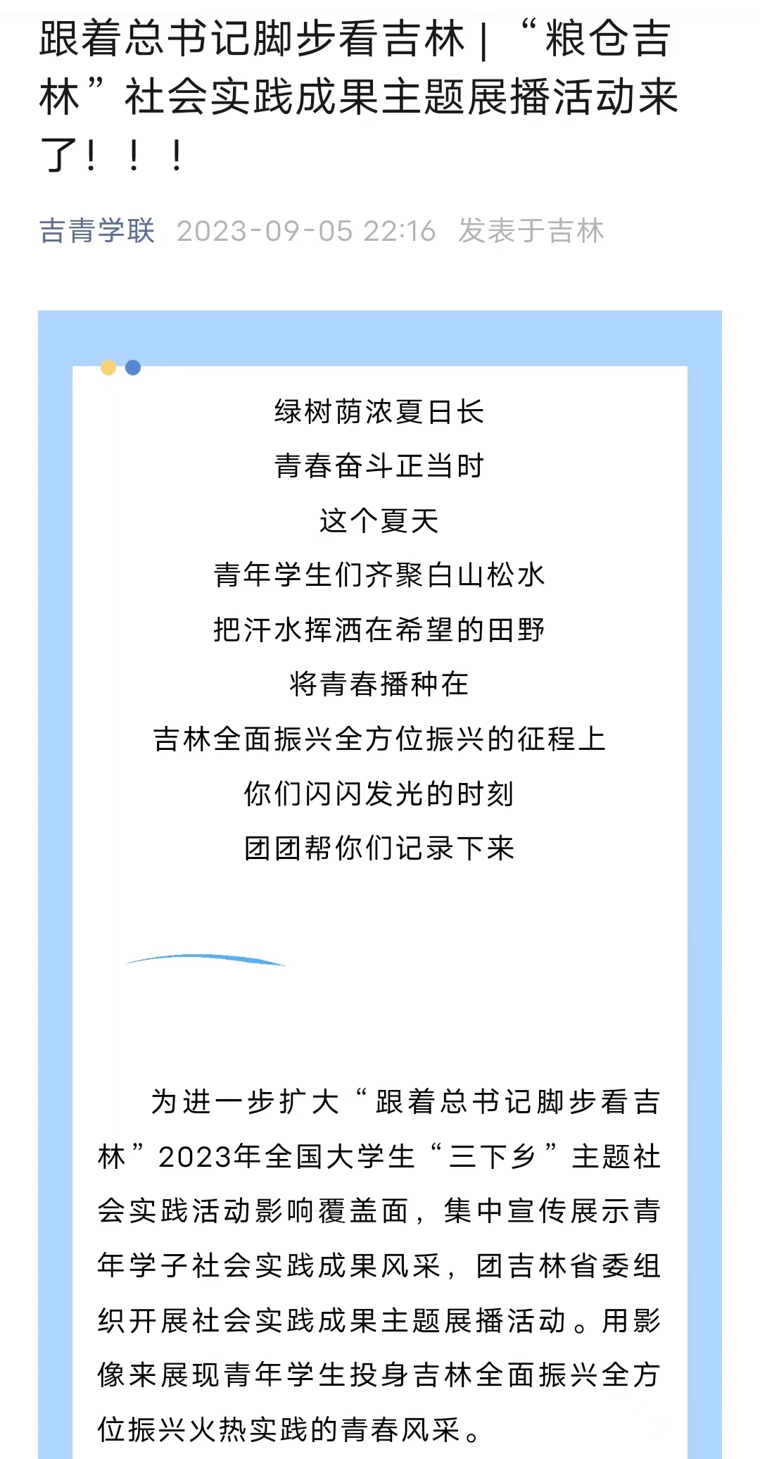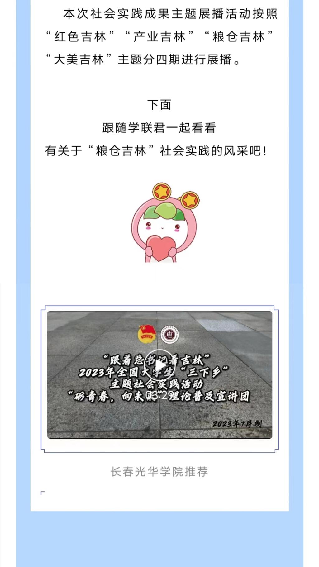 近日,吉青学联官微对“跟着总书记脚步看吉林”2023年全国大学生“三下乡”主题社会实践成果进行展播,其中展播出了beat365在线唯一官网登录“砺青春,向未来”理论普及宣讲团暑期“三下乡”社会实践活动。