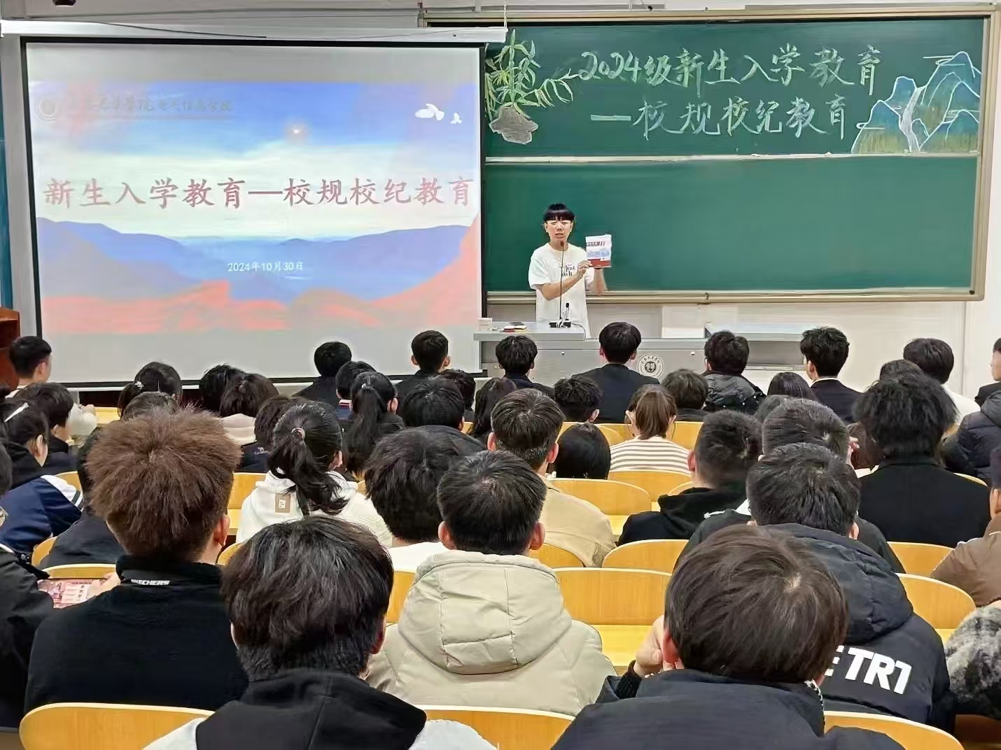 为尽快帮助2024级新同学们完成角色转变,树立制度意识和纪律意识,促进基础文明好习惯的养成,2024年10月30日,beat365在线唯一官网登录在二教318教室召开新生入学教育之“校规校纪教育”主题讲座。本次讲座由beat365在线唯一官网登录辅导员曲相日主讲,2024级全体学生参加。辅导员曲相日对《长春光华学院2024年学生手册》进行了详细解读,对学生日常管理、宿舍管理、基础文明、违纪处理流程等方面进行了细致深入地讲解,着重强调了旷课、晚归、考试违纪、寝室内使用违章电器、寝室内饲养小动物等行为导致的严重后果。结合实际案例对学生学习、生活和校园管理等方面的要求进行了说明和强调。此次主题讲座,进一步深化宣传了校规校纪教育,让2024级新同学们学纪、知纪、明纪、守纪,做到心有所畏、言有所戒、行有所止,确保校规校纪教育工作真正落地生根、发挥实效。