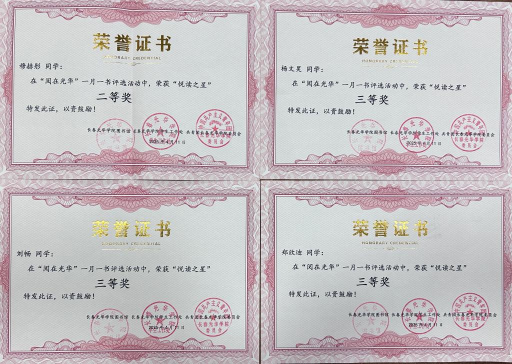 2025年4月3日,beat365在线唯一官网登录在beat3652024年“阅在光华”一月一书活动中荣获“优阅学院”称号;电信24401班等6个班级荣获“书香班级”称号;电信23401班刘畅等12名学生荣获“悦读之星”称号。