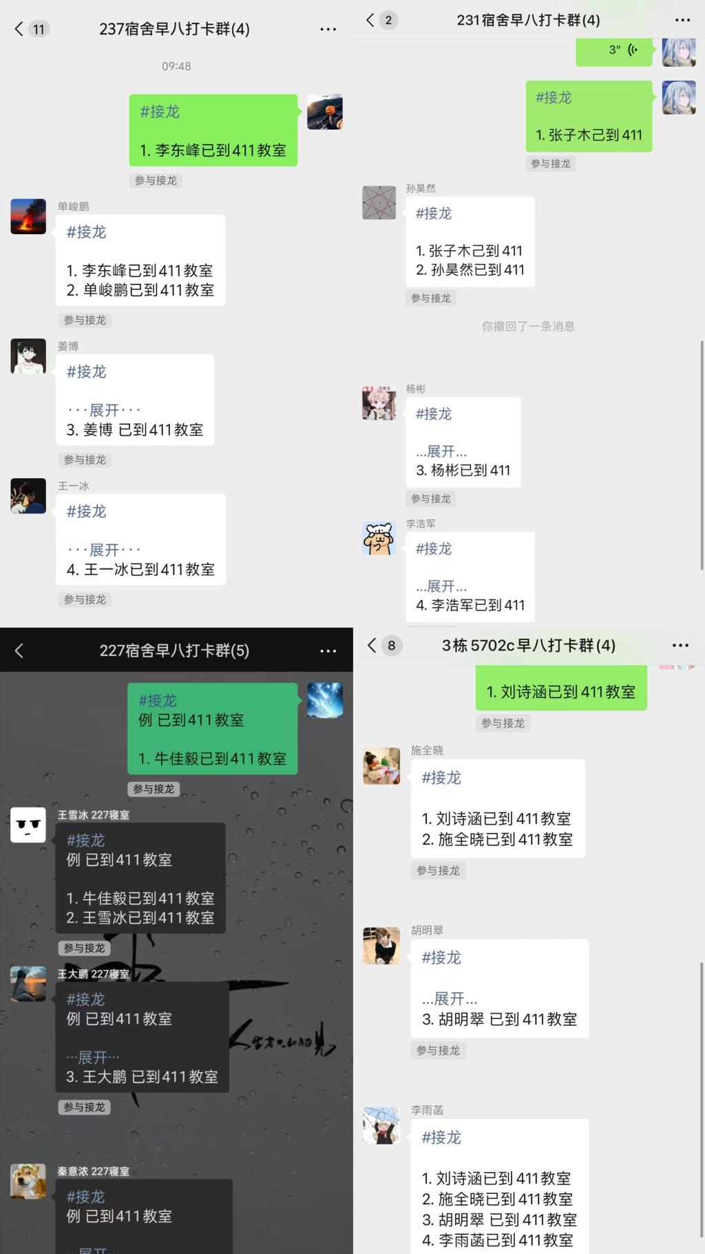 2025年5月6日-6月6日,beat365在线唯一官网登录2024级同学们开展“早八打卡新机制,学风养成进行时”主题活动。活动中,各班级以寝室为单位组建打卡签到群,课前同学们在教室门口拍摄包含门牌的全员打卡照,实时上传至群内接龙。这种可视化的打卡模式,让“按时到课”从制度要求转化为自觉行动,为课堂学习筑牢纪律基石。