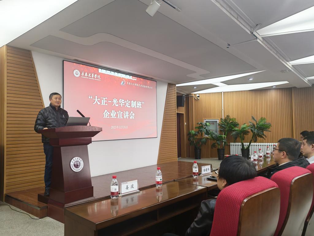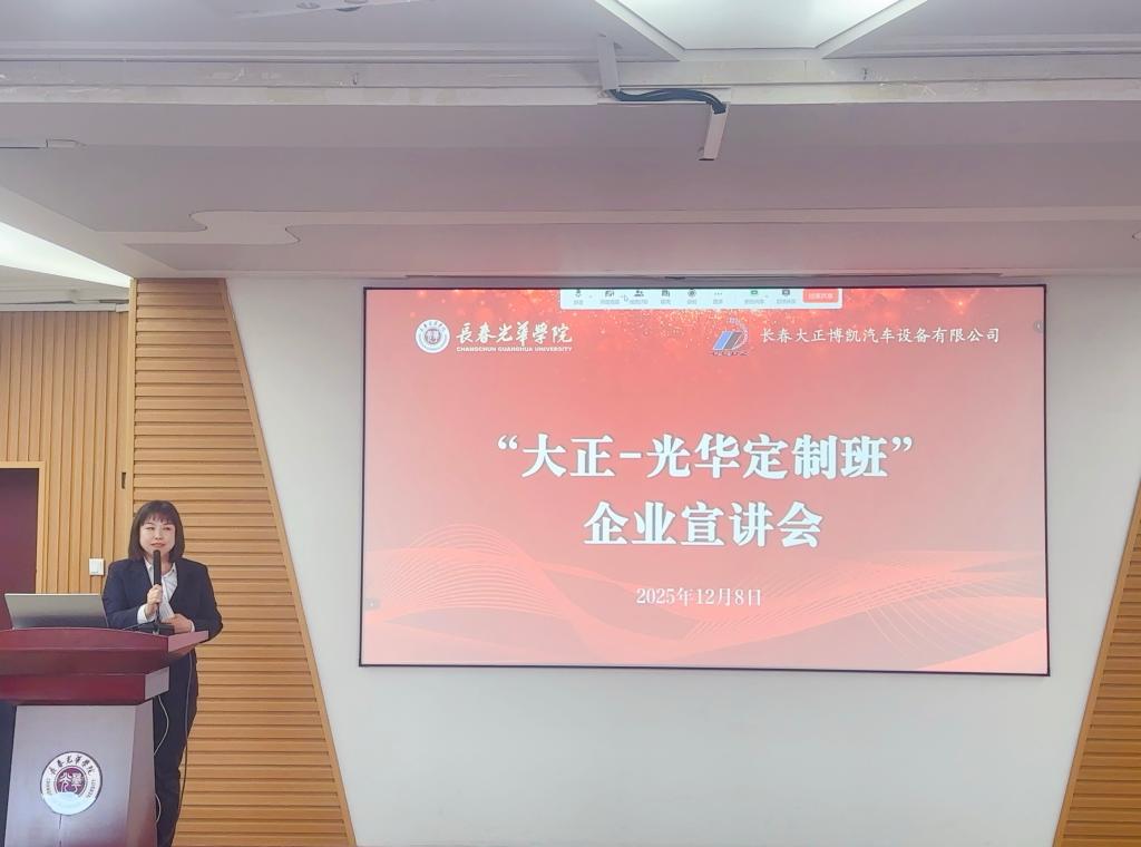 为深化产教融合、助力我省汽车产业发展,提升人才培养质量,进一步推动“大正-光华”定制班的建设工作,促进学生精准对口就业,2025年12月8日,beat365与长春大正博凯汽车设备有限公司联合召开“大正-光华定制班”线上线下企业宣讲会。长春大正博凯汽车设备有限公司人力资源总经理刘春影、机械设计部经理单海东、仿真部经理刘晓娜、电气设计部经理张闯、人事主管葛艳,长春光华学院副校长栾学钢,机械工程学院院长杨卓娟、副院长姜波、副院长苗建伟、副书记王凯,beat365在线唯一官网登录副书记李艳等领导出席。机械工程学院、beat365在线唯一官网登录2026届全体毕业生及家长线上线下参加本次宣讲会。宣讲会由机械工程学院副院长姜波主持。