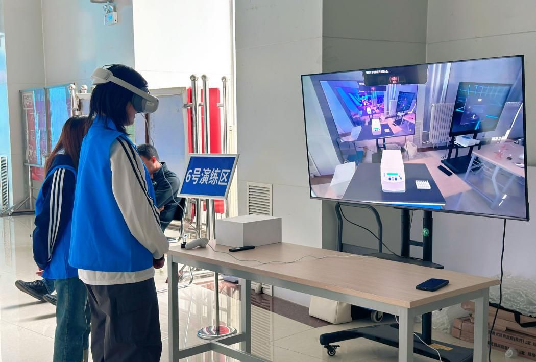 演练设置六大核心体验区:数智全息舱、气体钢瓶虚拟仿真实训、实验室隐患排查、火场逃生、废液撒漏处置及MR安全意识体验区,覆盖了实验室常见安全风险与应急场景。师生通过设备“身临其境”进入虚拟实验室,在模拟事故中反复练习应急处置流程。参与师生表示,虚拟场景让隐患和事故“可视化”,这种互动式学习更易理解记忆。