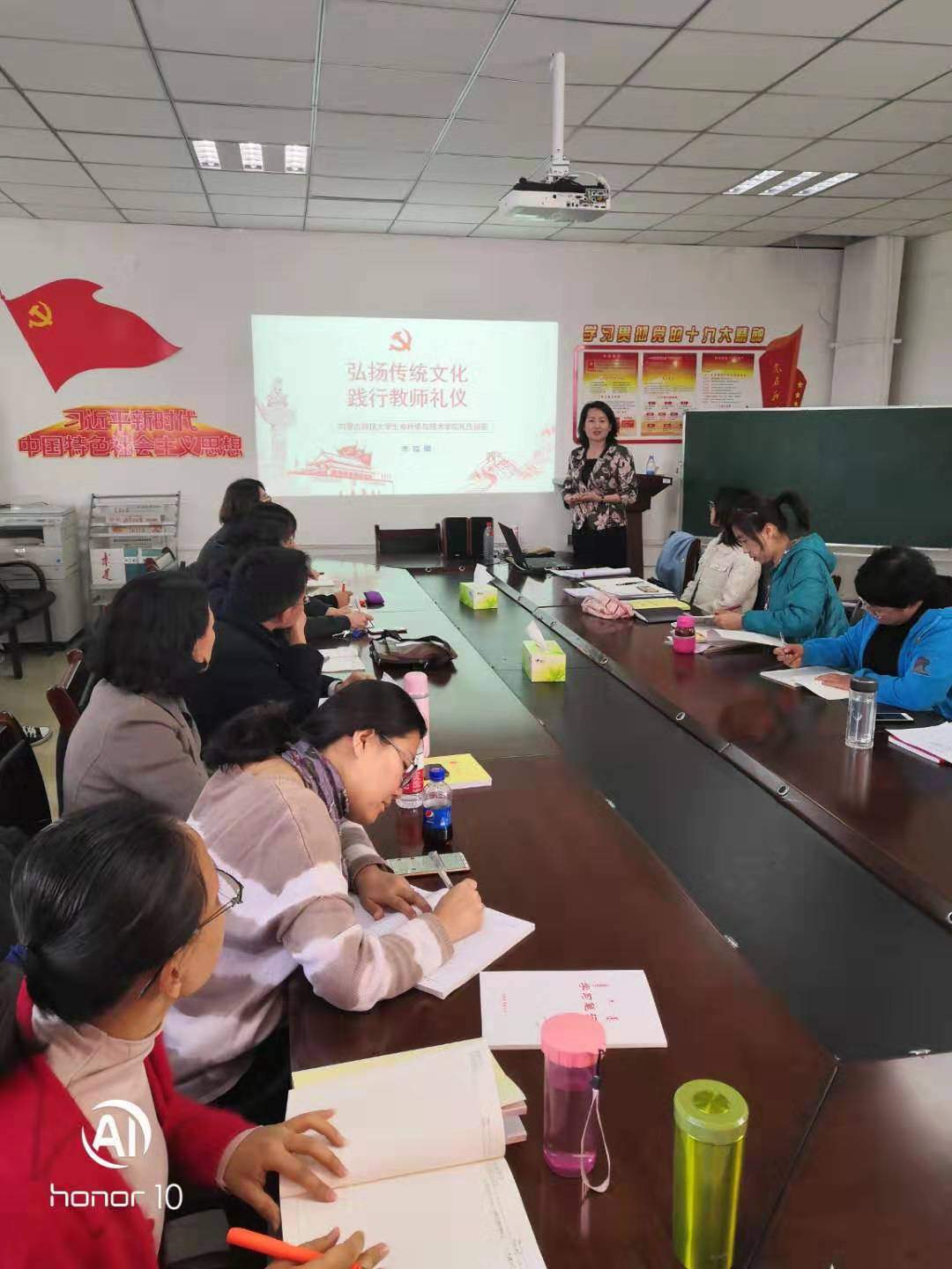 2019年10月24日下午,kaiyun开云官方网站邀请党政办公室李瑞卿老师为全体教工党员做了“不忘初心、牢记使命”主题教育专题讲座,讲座题目为《弘扬传统文化、践行教师礼仪》。