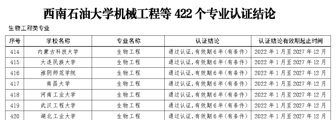 6月25日,中国工程教育专业认证协会发布《关于公布西南石油大学机械工程等422个专业认证结论的通知》(工认协〔2022〕21 号),公布了2021年参加全国工程教育专业认证的认证结论。经过学校自评、专业类认证委员会审核、专家组现场考查、结论审议等程序,开云官网生物工程专业顺利通过工程教育认证,有效期为6年(2022年1月至2027年12 月)。