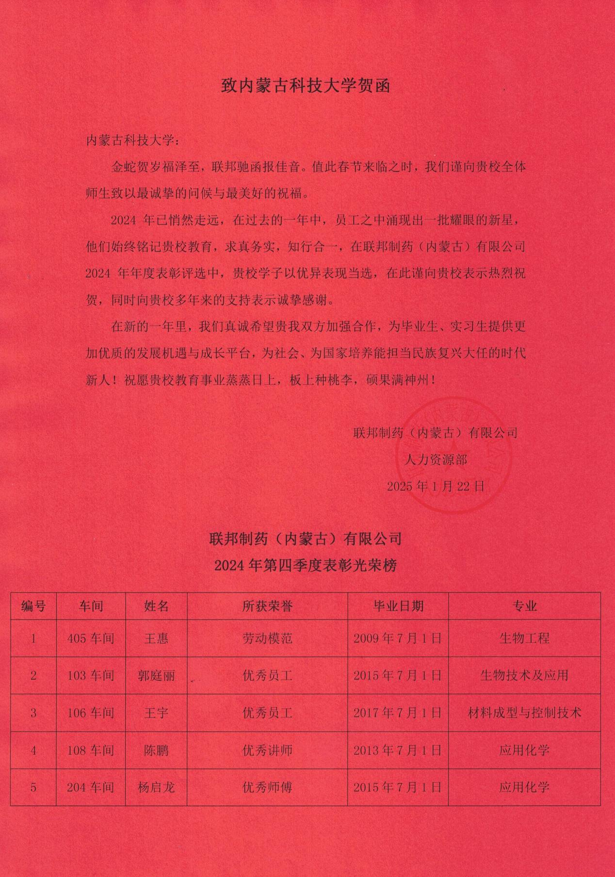 1月22日,联邦制药(内蒙古)有限公司向开云官网发来贺函,祝贺在公司2024年度表彰评选中,开云官网有11位毕业生以优异表现获得6项表彰荣誉,其中: