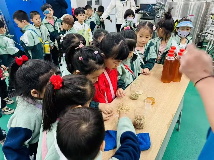 在工程训练中心A219啤酒实验室,孩子们瞬间化身充满好奇心的“小小科学家”。王蕾老师和卢庆华老师化身科学魔法师,用生动有趣的语言,向孩子们揭开啤酒酿造的神秘面纱。麦芽、水和酵母,这些看似普通的原料,在老师们的讲解下,仿佛拥有了神奇的魔力,在发酵过程中“变身”为香醇的啤酒。小朋友们不仅认真聆听讲解,还纷纷伸出小手,触摸大麦种子,近距离观察发酵原料和设备,感受着科学如何融入日常生活,现场不时响起惊叹声与欢笑声。